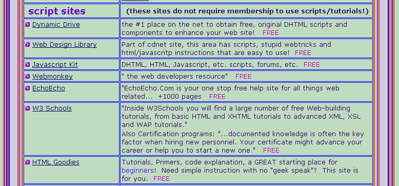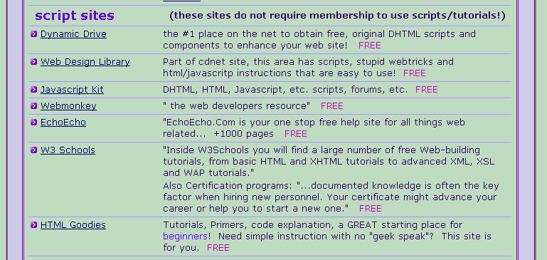 I have a page on my website that showcases several products/services. They are all listed in a simple 2 column table with the inner borders turned on and the outer borders set to invisible (dotted lines). (My 2 column table is inside 2 larger tables). Each product is on it's own row. Each has a link using the LINK TO URL to a site off my website, opening in a new window so the visitor remains on my site. The top half of the page is CSB/Trellix user related links, the bottom is the area called HELPFUL RESOURCES - the table I describe above.