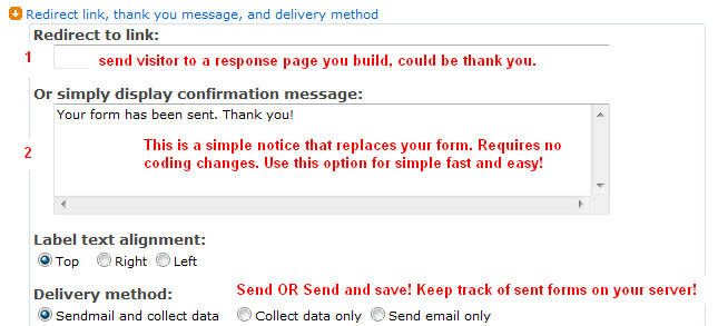 ![]() 2) Display confirmation message: If you choose this option the form needs no coding adjustments, and is ready to implement when you upload it to your website. You can change the text of the message to suit your needs and requires no extra page. Fastest, simplest option. Check out FRAME5 for a sample of the confirmation message response. That sample also shows that you can turn off email and use the form to just gather information from your visitors.