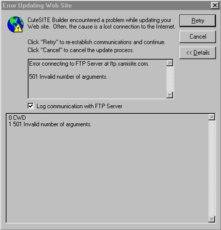 Try to publish again. This time, CSB will log the entire publishing process. No log file is created on your website or computer. CSB provides the log error details in the lower window to help diagnose the problem. Many times (not this particular case), the details are very specific.