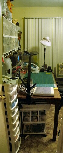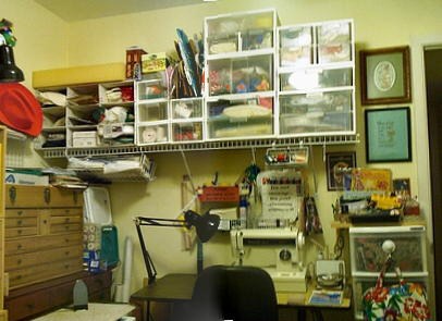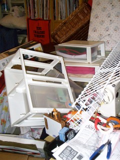 The drawers containing beads, pearls, ribbons, laces, assorted craft materials tipped over and dumped all over.