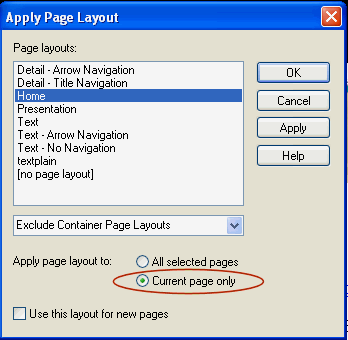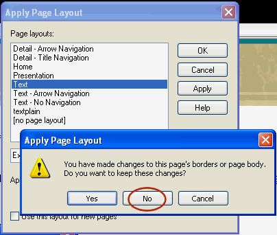 ![]() If you have unlocked static areas of your web page and made local formatting changes in page body or border (for example, changed a color or inserted a background picture, added text), you will get a warning when you try to APPLY A PAGE LAYOUT.